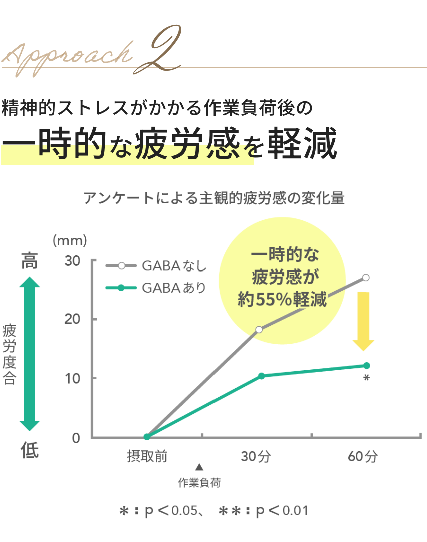 GABAなしとGABAありをそれぞれ単回摂取し、精神的ストレスがかかる作業負荷後の唾液中クロモグラニンAと疲労感VASを評価