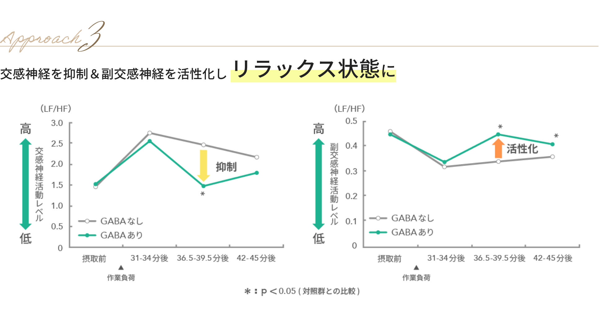 GABAなしとGABAありをそれぞれ単回摂取し、精神的ストレスがかかる作業負荷後の交感神経と副交感神経の活動を評価