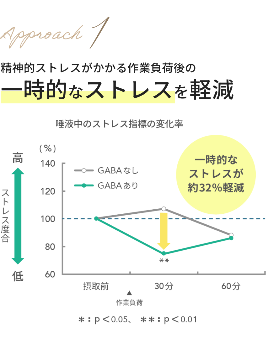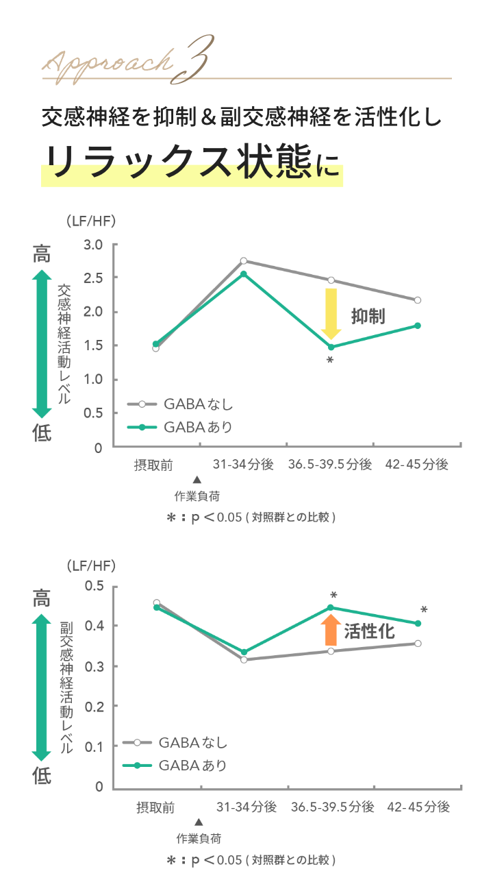 GABAなしとGABAありをそれぞれ単回摂取し、精神的ストレスがかかる作業負荷後の交感神経と副交感神経の活動を評価